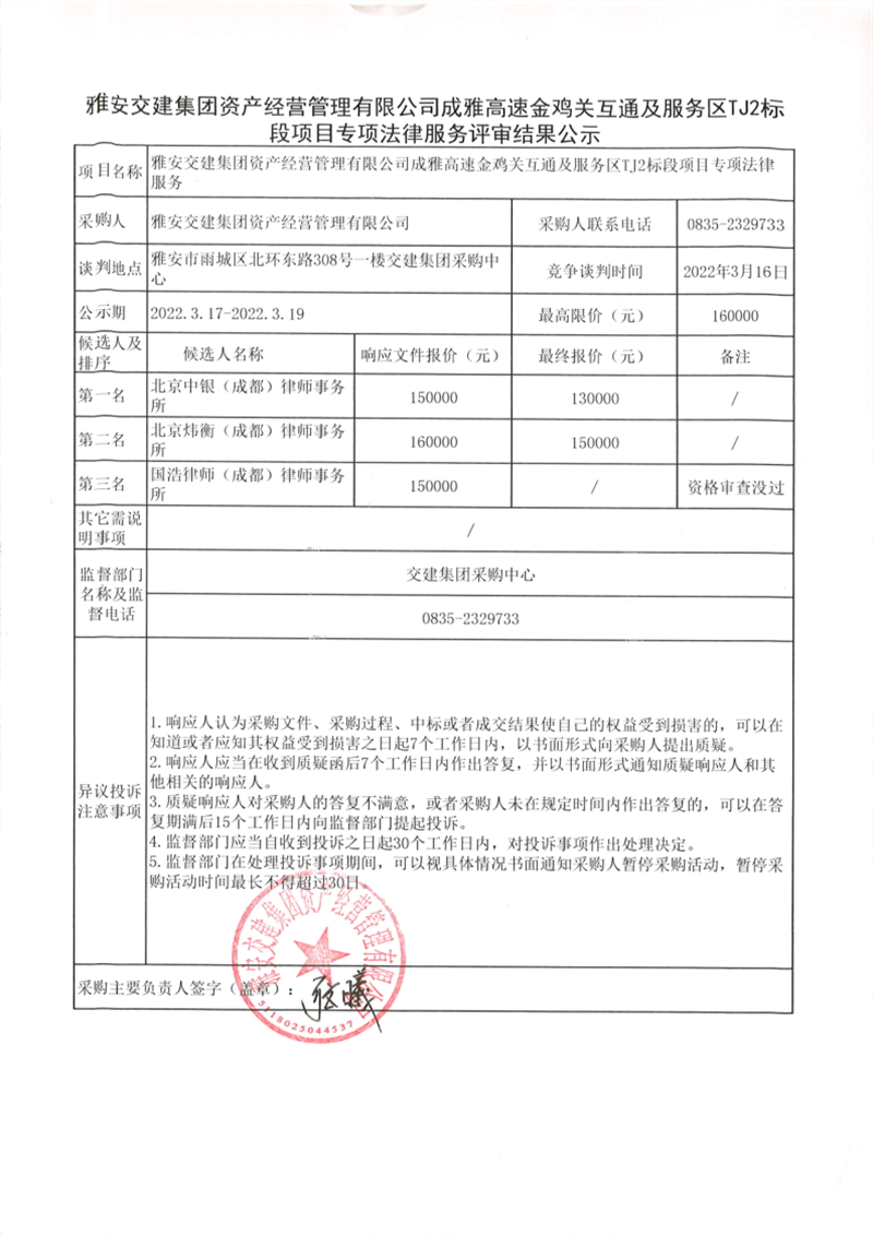 雅安交建集團資產(chǎn)經(jīng)營管理有限公司成雅高速金雞關(guān)互通及服務區(qū)TJ2標段項目專項法律服務評審結(jié)果公示