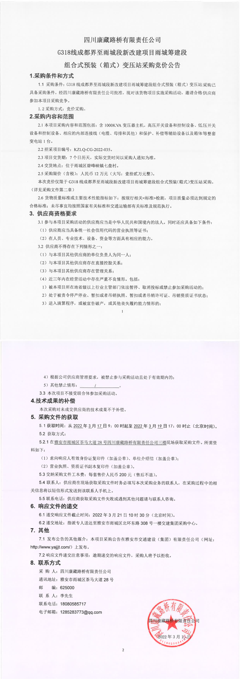 四川康藏路橋有限責(zé)任公司G318線成都界至雨城段新改建項(xiàng)目雨城籌建段組合式預(yù)裝(箱式)變壓站采購(gòu)競(jìng)價(jià)公告