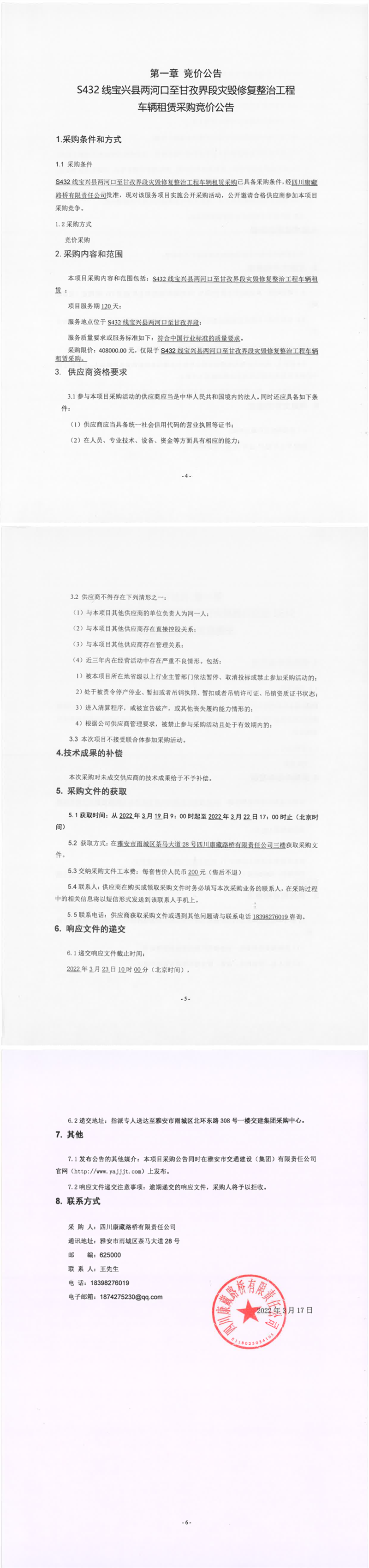 四川康藏路橋有限責(zé)任公司S432線寶興縣兩河口至甘孜界段災(zāi)毀修復(fù)整治工程車輛租賃采購(gòu)競(jìng)價(jià)公告
