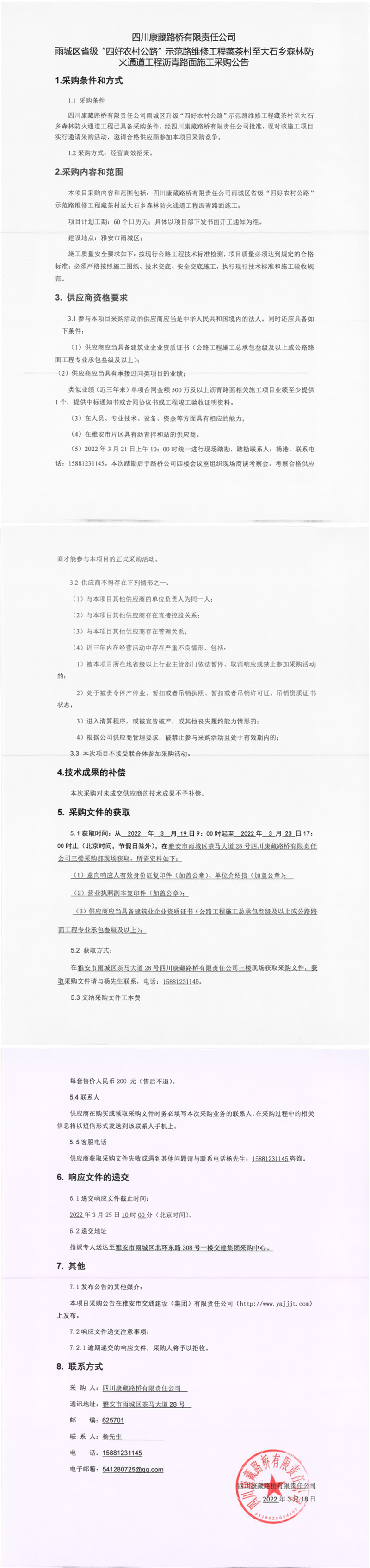 四川康藏路橋有限責任公司雨城區(qū)省級“四好農(nóng)村公路”示范路維修工程藏茶村至大石鄉(xiāng)森林防火通道工程瀝青路面施工采購公告