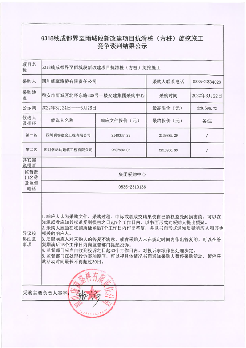 四川康藏路橋有限責任公司G318線成都界至雨城段新改建項目抗滑樁(方樁)旋挖施工競爭談判結果公示