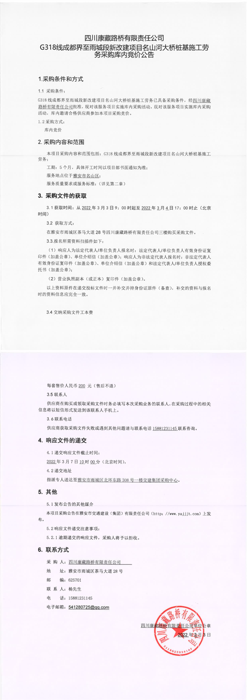 四川康藏路橋有限責(zé)任公司G318線成都界至雨城段新改建項(xiàng)目名山河大橋樁基施工勞務(wù)采購庫內(nèi)競價(jià)公告