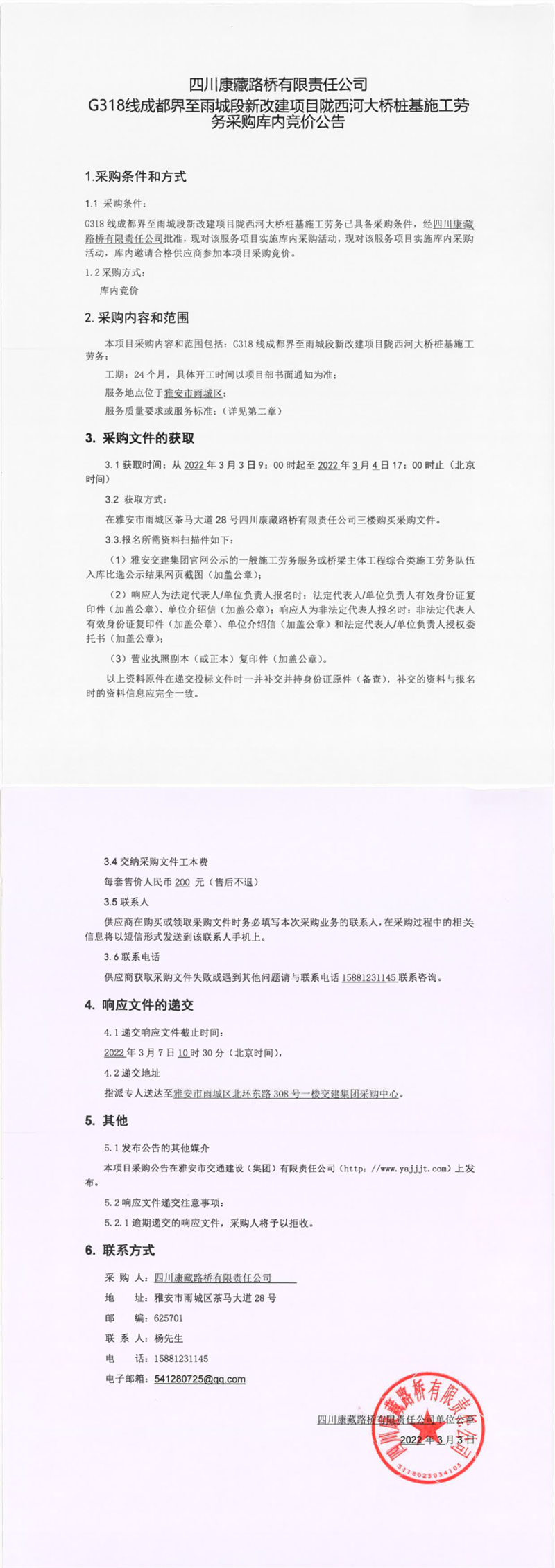 四川康藏路橋有限責(zé)任公司G318線成都界至雨城段新改建項(xiàng)目名山河大橋樁基施工勞務(wù)采購(gòu)庫(kù)內(nèi)競(jìng)價(jià)公告