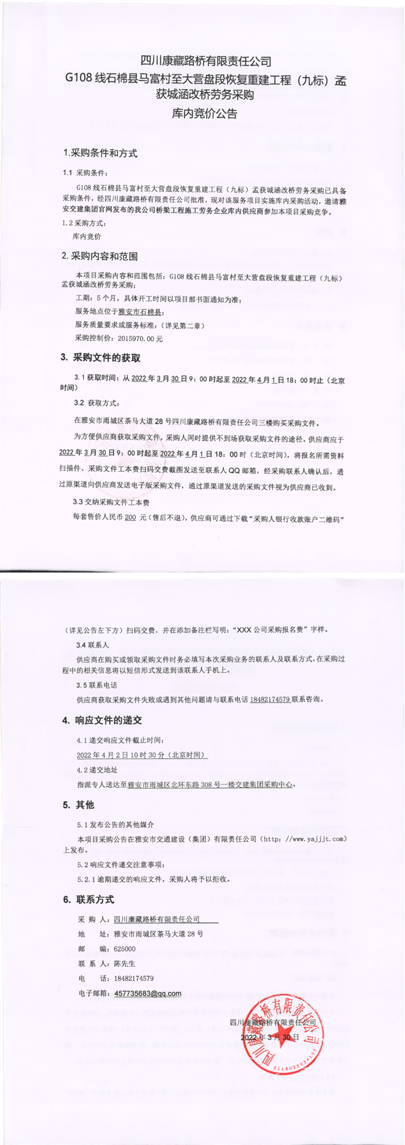 四川康藏路橋有限責任公司G108線石棉縣馬富村至大營盤段恢復重建工程(九標)孟獲城涵改橋勞務采購庫內競價公告