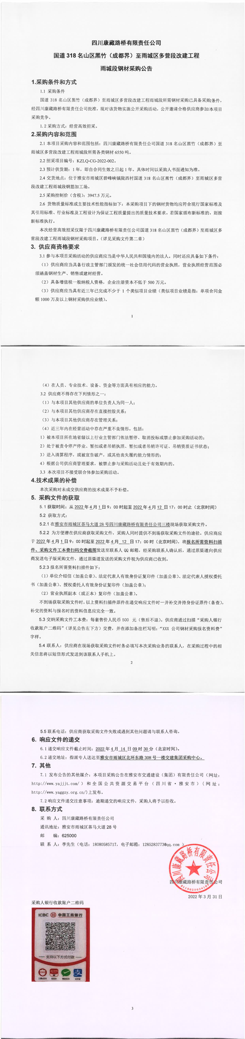 四川康藏路橋有限責(zé)任公司國(guó)道318名山區(qū)黑竹(成都界)至雨城區(qū)多營(yíng)段改建工程雨城段鋼材采購(gòu)公告