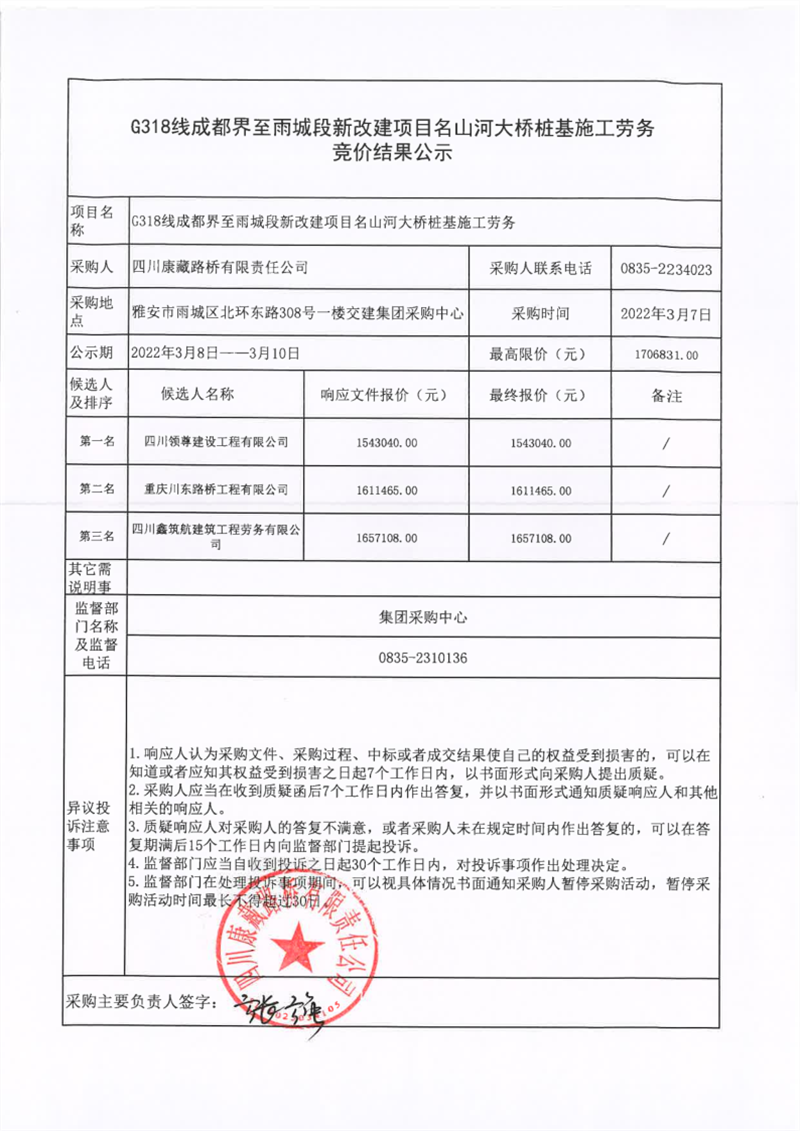 四川康藏路橋有限責任公司G318線成都界至雨城段新改建項目名山河大橋樁基施工勞務競價結果公示