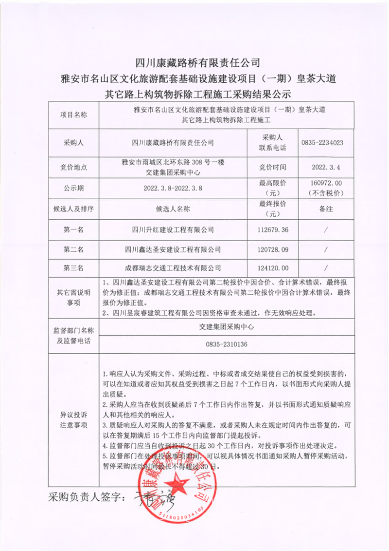 四川康藏路橋有限責(zé)任公司雅安市名山區(qū)文化旅游配套基礎(chǔ)設(shè)施建設(shè)項目(一期)皇茶大道其它路上構(gòu)筑物拆除工程施工采購結(jié)果公示