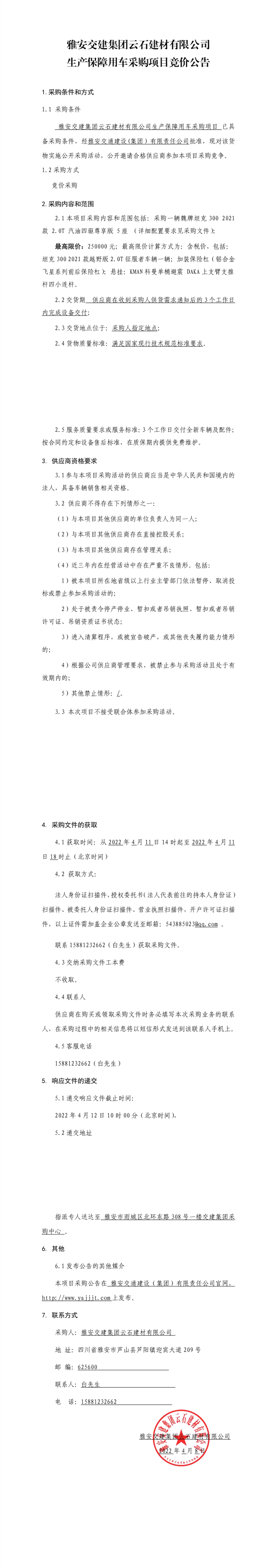 雅安交建集團(tuán)云石建材有限公司生產(chǎn)保障用車采購項(xiàng)目競價(jià)公告