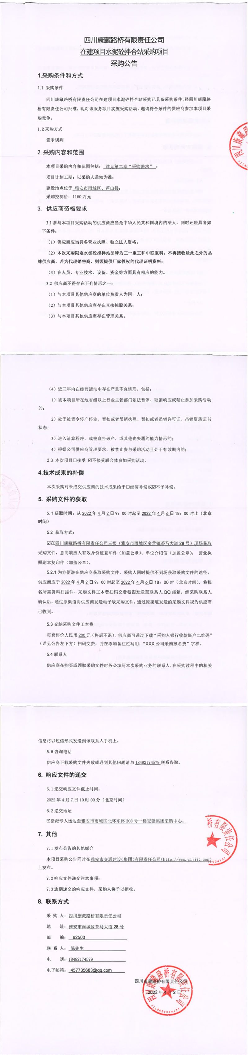四川康藏路橋有限責(zé)任公司在建項(xiàng)目水泥砼拌合站采購(gòu)項(xiàng)目采購(gòu)公告