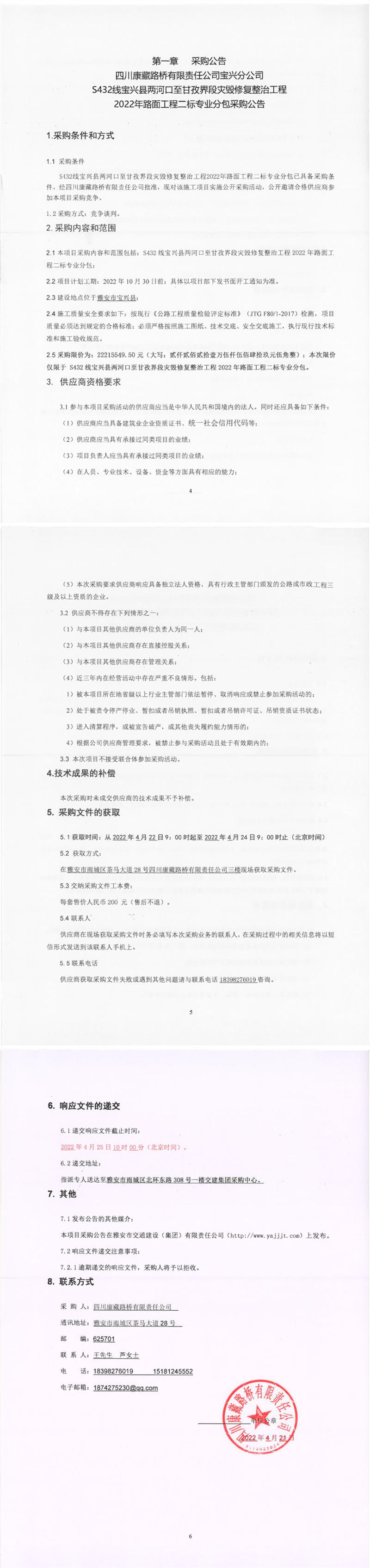 四川康藏路橋有限責任公司S432線寶興縣兩河口至甘孜界段災毀修復整治工程2022年路面工程二標專業(yè)分包采購公告