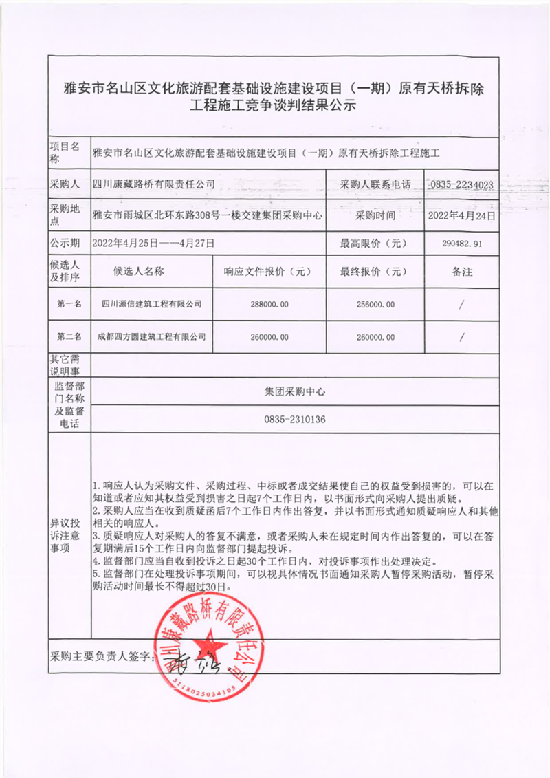 四川康藏路橋有限責(zé)任公司雅安市名山區(qū)文化旅游配套基礎(chǔ)設(shè)施建設(shè)項(xiàng)目(一期)原有天橋拆除工程施工競爭談判結(jié)果公示