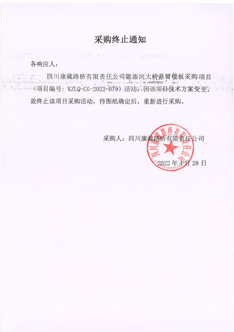 四川康藏路橋有限責(zé)任公司隴西河大橋懸臂模板采購終止通知