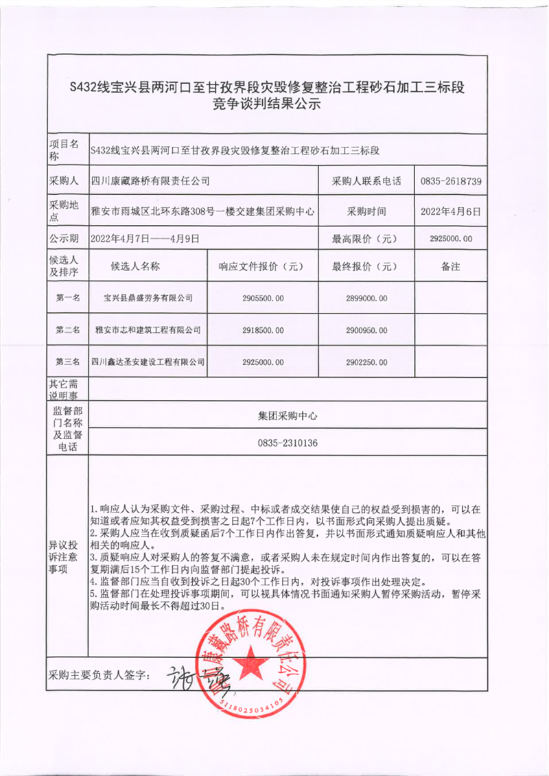 四川康藏路橋有限責任公司S432線寶興縣兩河口至甘孜界段災(zāi)毀修復(fù)整治工程砂石加工三標段競爭談判結(jié)果公示