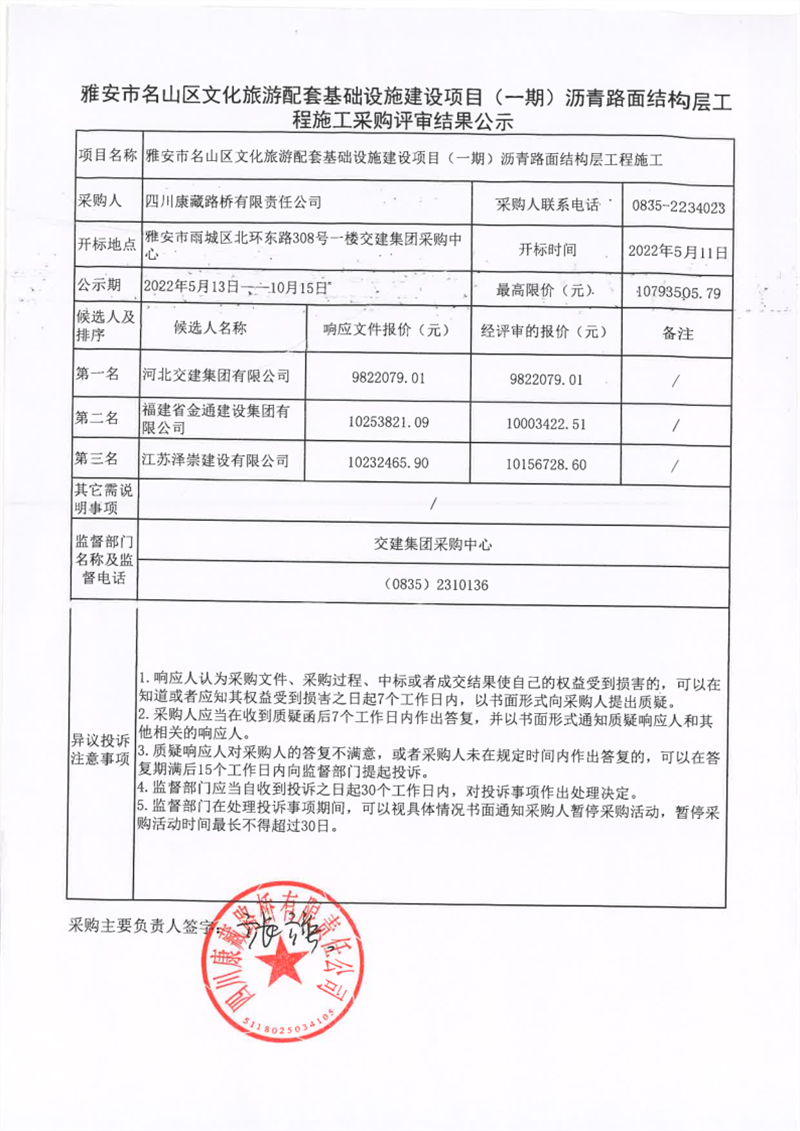 四川康藏路橋有限責(zé)任公司雅安市名山區(qū)文化旅游配套基礎(chǔ)設(shè)施建設(shè)項(xiàng)目(一期)瀝青路面結(jié)構(gòu)層工程施工采購(gòu)評(píng)審結(jié)果公示