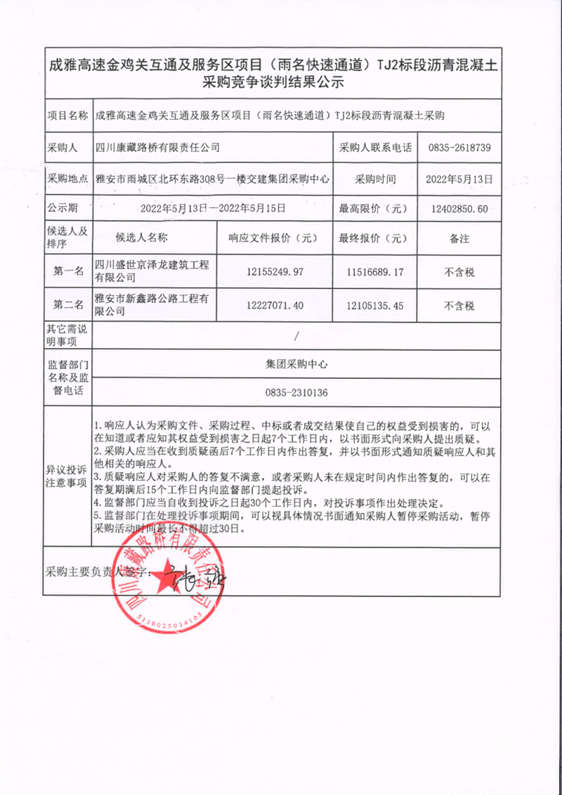 四川康藏路橋有限責(zé)任公司成雅高速金雞關(guān)互通及服務(wù)區(qū)項(xiàng)目(雨名快速通道)TJ2標(biāo)段瀝青混凝土采購(gòu)競(jìng)爭(zhēng)談判結(jié)果公示
