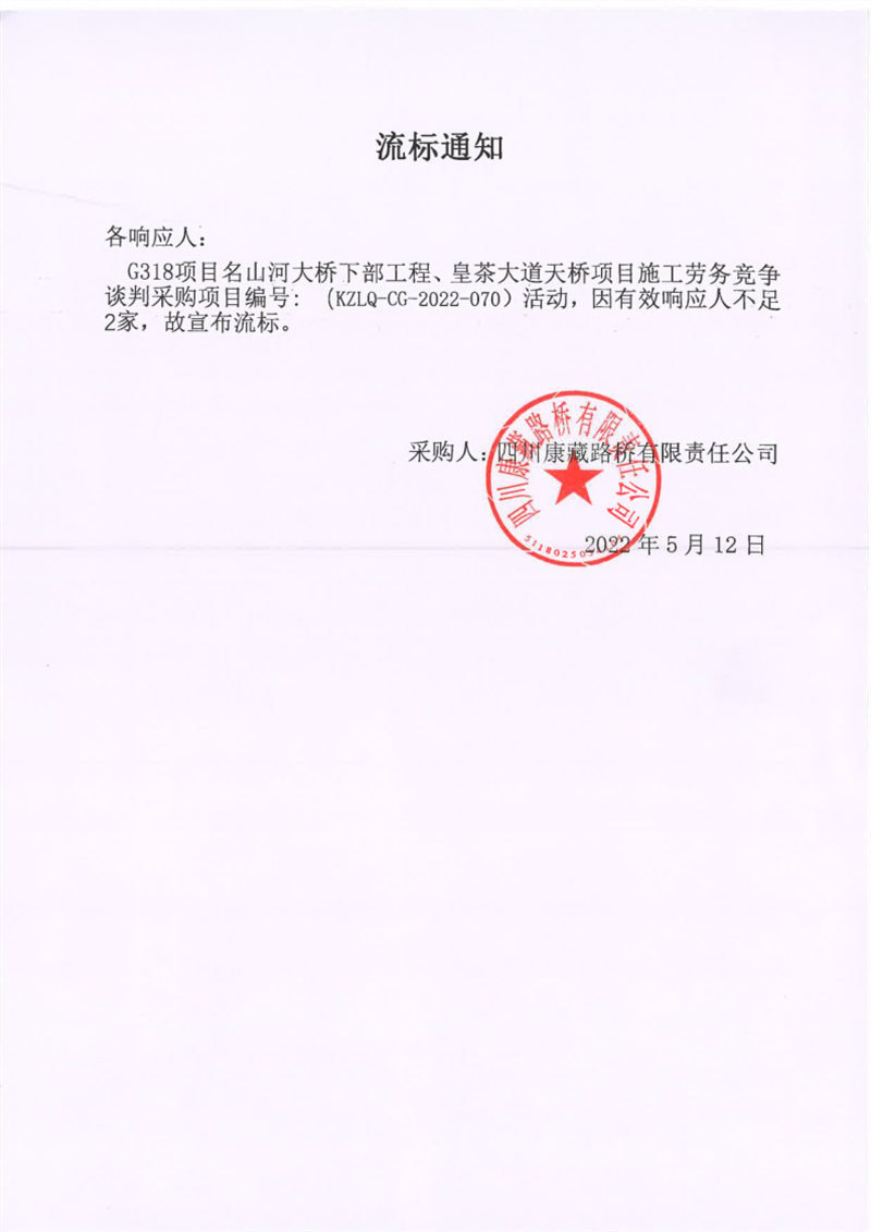 四川康藏路橋有限責(zé)任公司G318項(xiàng)目名山河大橋下部工程、皇茶大道天橋項(xiàng)目施工勞務(wù)談判采購項(xiàng)目流標(biāo)通知