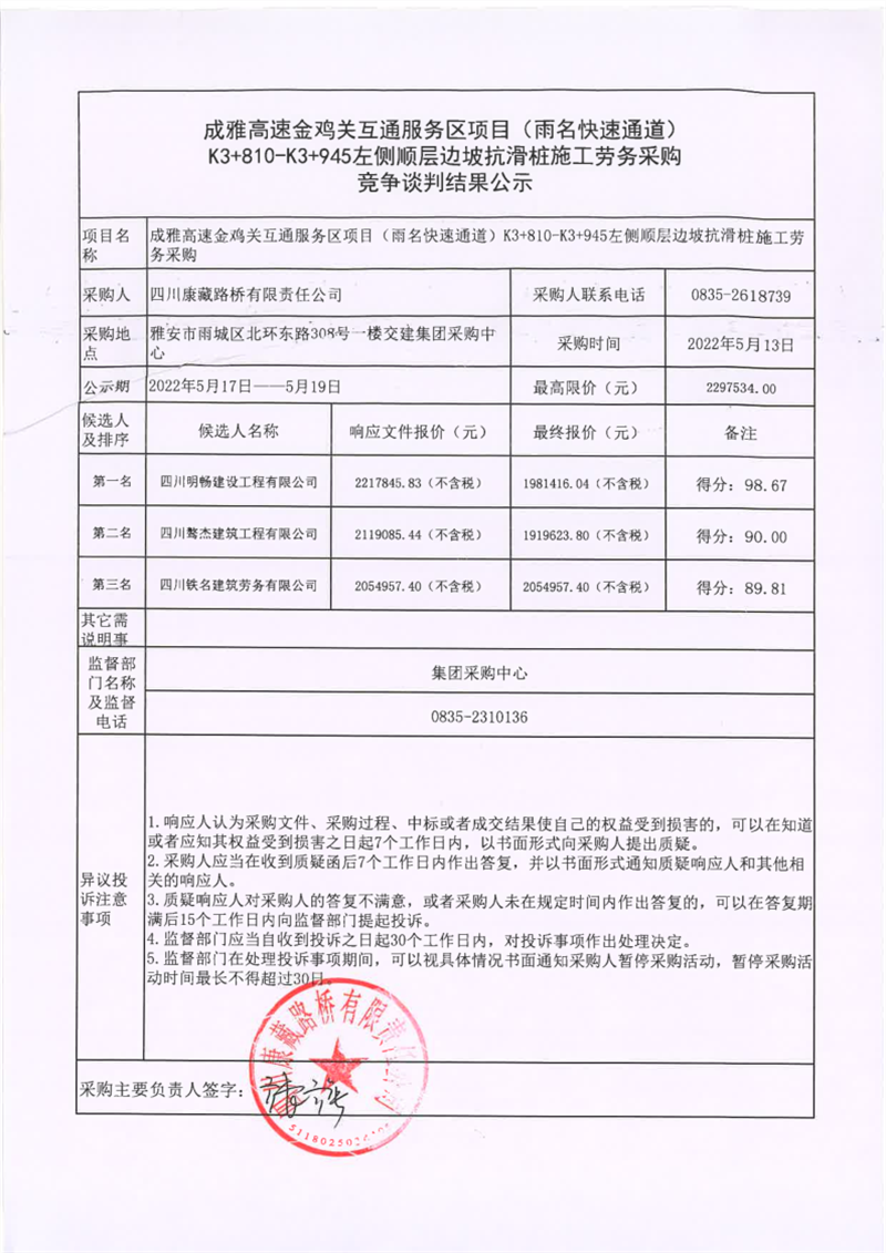 四川康藏路橋有限責(zé)任公司成雅高速金雞關(guān)互通服務(wù)區(qū)項目(雨名快速通道)K3+810-K3+945左側(cè)順層邊坡抗滑樁施工勞務(wù)采購競爭談判結(jié)果公示