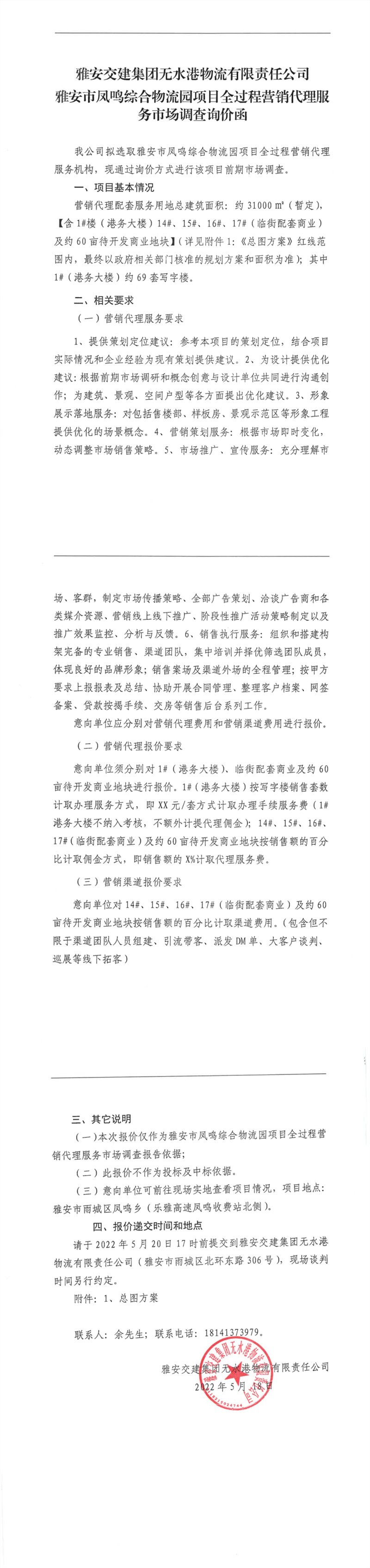 雅安交建集團(tuán)無水港物流有限責(zé)任公司雅安市鳳鳴綜合物流園項(xiàng)目全過程營(yíng)銷代理服務(wù)市場(chǎng)調(diào)查詢價(jià)函