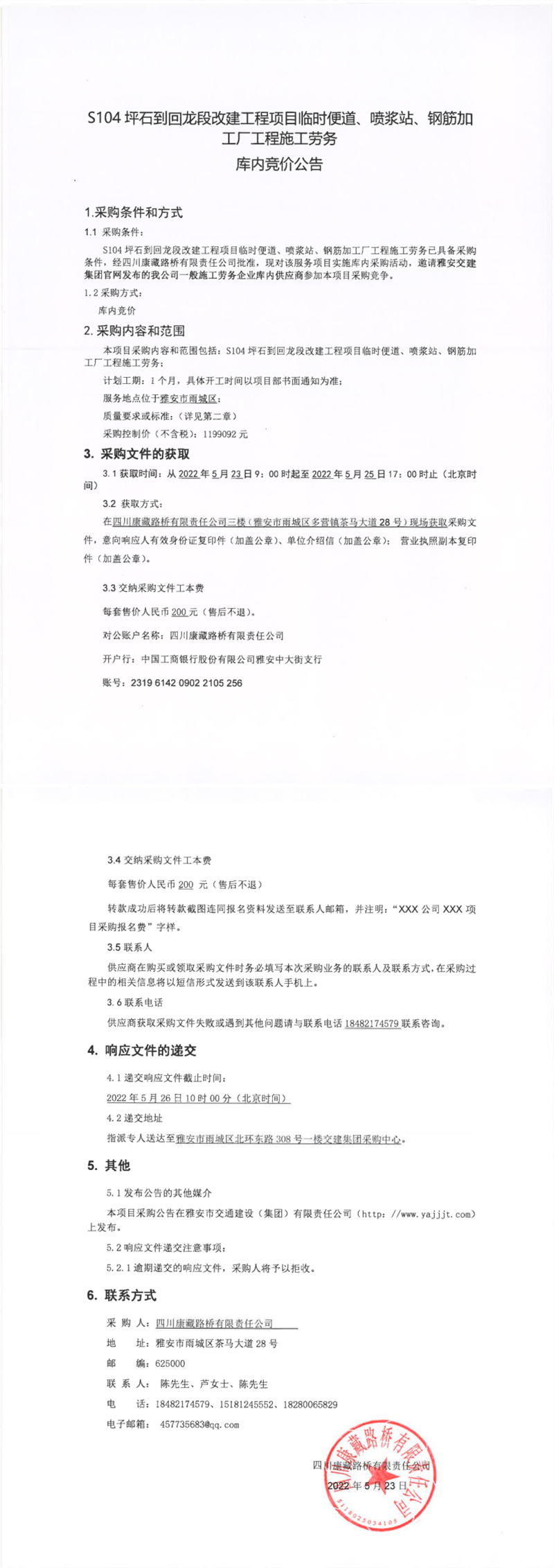 四川康藏路橋有限責(zé)任公司S104坪石到回龍段改建工程項目臨時便道、噴漿站、鋼筋加工廠工程施工勞務(wù)庫內(nèi)競價公告
