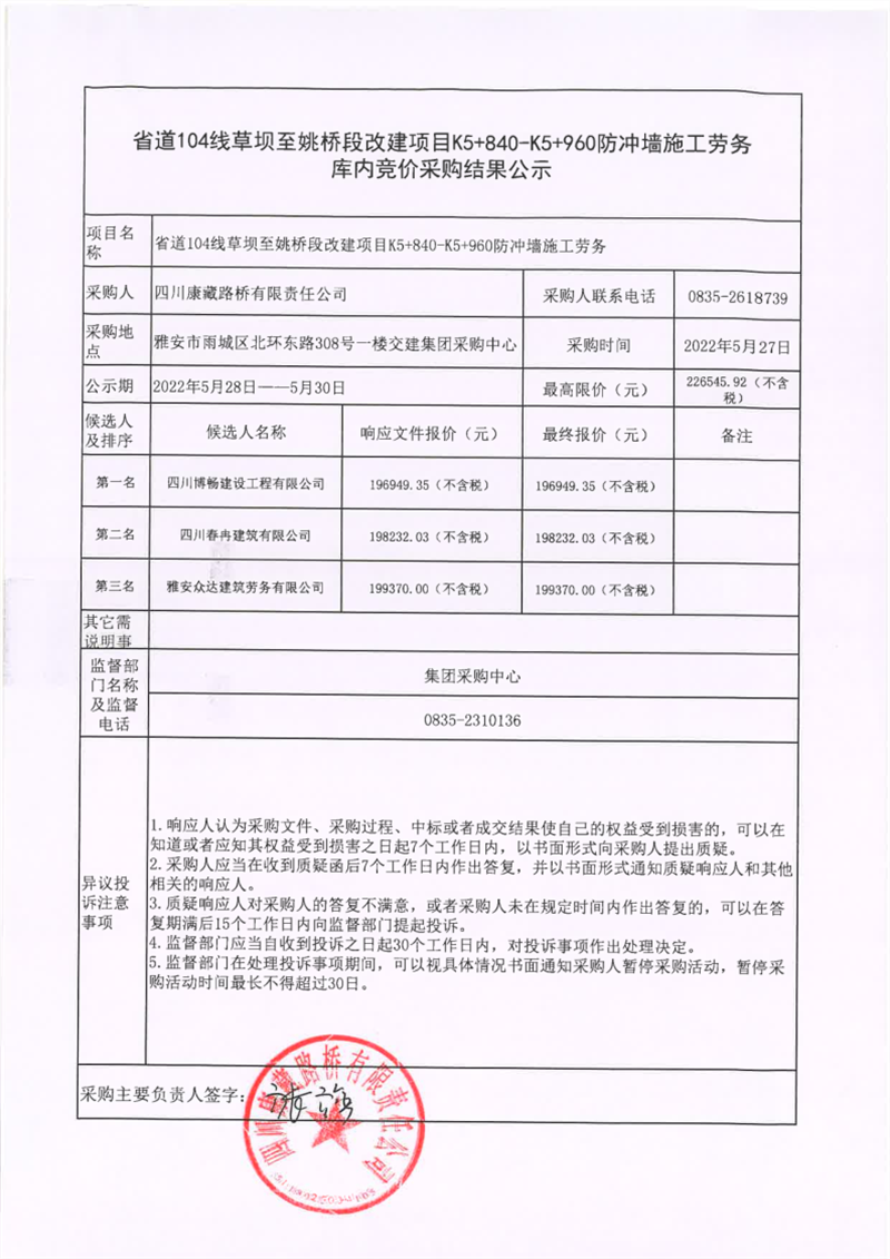 四川康藏路橋有限責任公司省道104線草壩至姚橋段改建項目K5+840-K5+960防沖墻施工勞務庫內(nèi)競價采購結果公示
