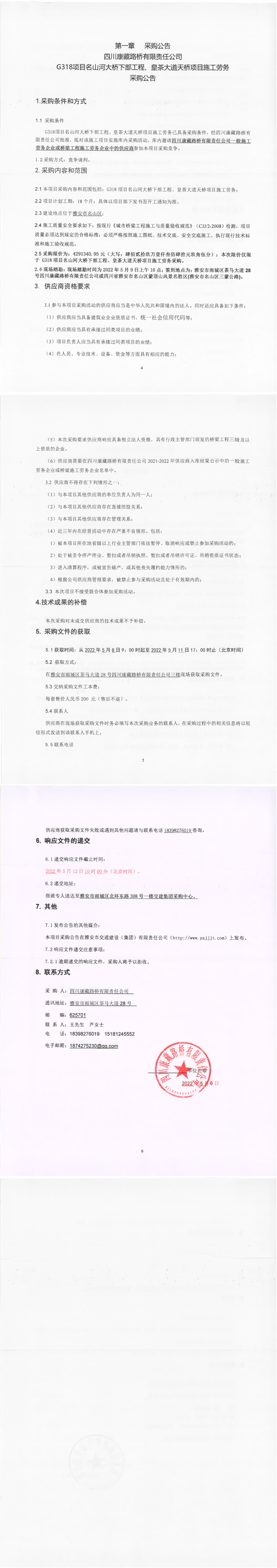 四川康藏路橋有限責(zé)任公司G318項(xiàng)目名山河大橋下部工程、皇茶大道天橋項(xiàng)目施工勞務(wù)采購公告