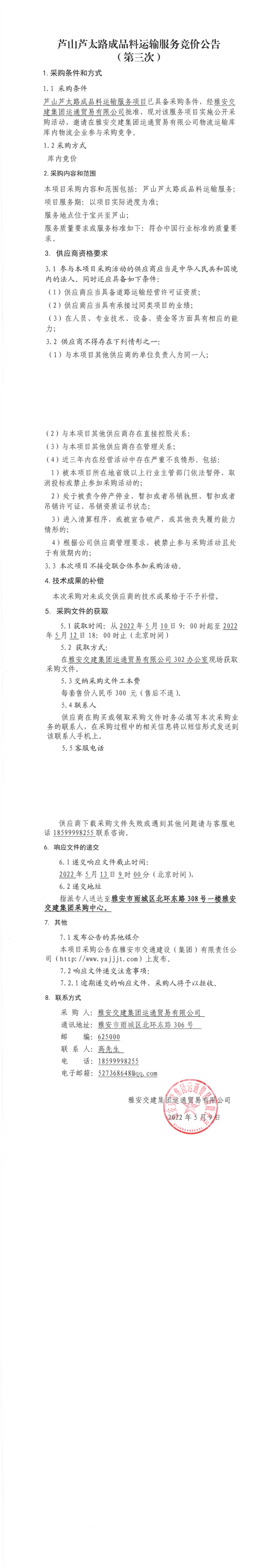 雅安交建集團(tuán)運(yùn)通貿(mào)易有限公司蘆山蘆太路成品料運(yùn)輸服務(wù)競價(jià)公告(第三次)