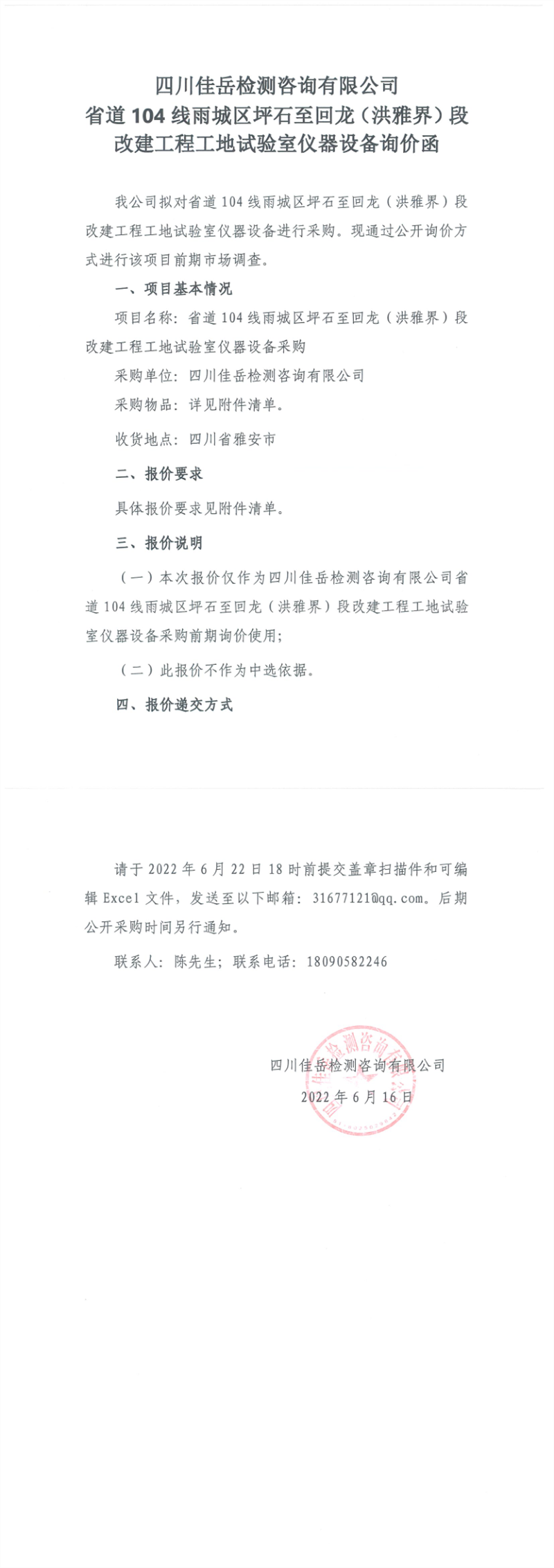 四川佳岳檢測咨詢有限公司省道104線雨城區(qū)坪石至回龍(洪雅界)段改建工程工地試驗(yàn)室儀器設(shè)備詢價(jià)函