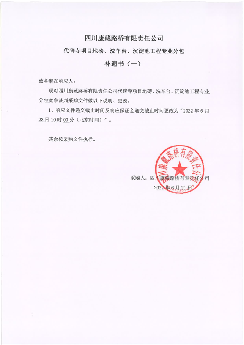 四川康藏路橋有限責(zé)任公司代碑寺項(xiàng)目地磅、洗車臺、沉淀池工程專業(yè)分包補(bǔ)遺書(一)