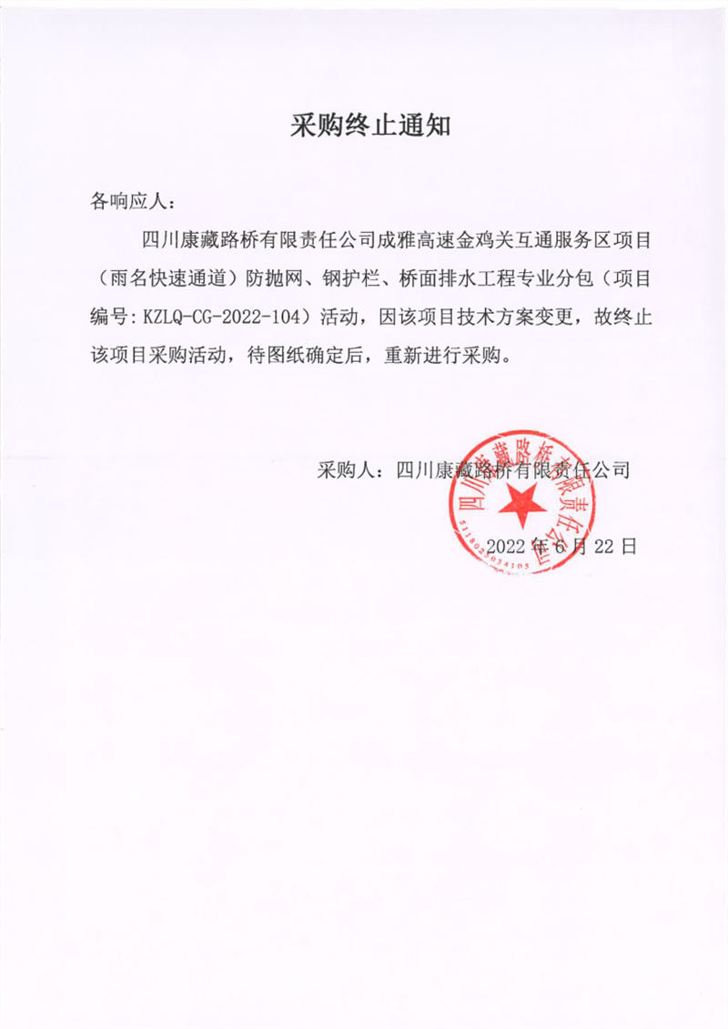 四川康藏路橋有限責(zé)任公司成雅高速金雞關(guān)互通服務(wù)區(qū)項(xiàng)目(雨名快速通道)防拋網(wǎng)、鋼護(hù)欄、橋面排水工程專業(yè)分包采購終止通知