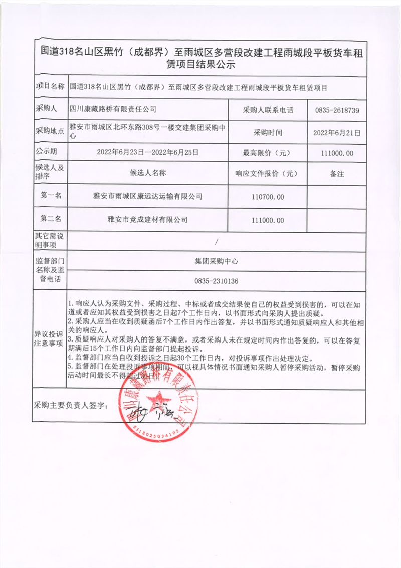 四川康藏路橋有限責(zé)任公司國(guó)道318名山區(qū)黑竹(成都界)至雨城區(qū)多營(yíng)段改建工程雨城段平板貨車租賃項(xiàng)目結(jié)果公示