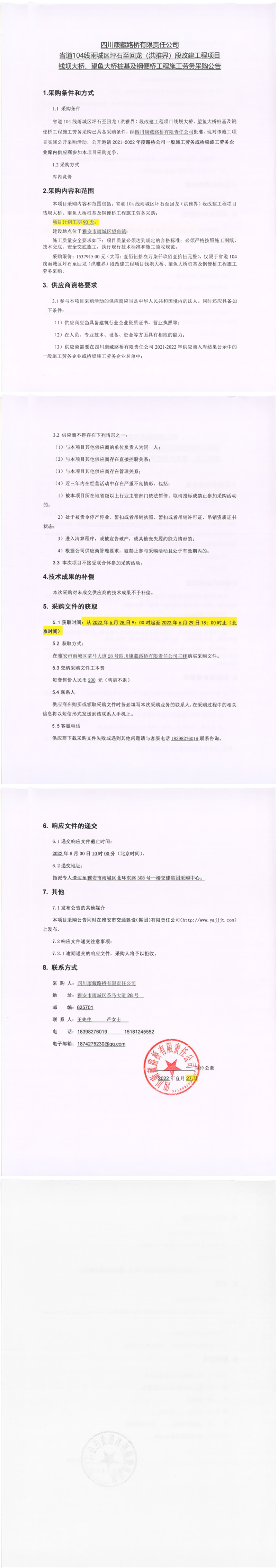 四川康藏路橋有限責(zé)任公司G318項目名山河大橋下部工程、皇茶大道天橋項目施工勞務(wù)采購(第二次)競爭談判采購結(jié)果公示