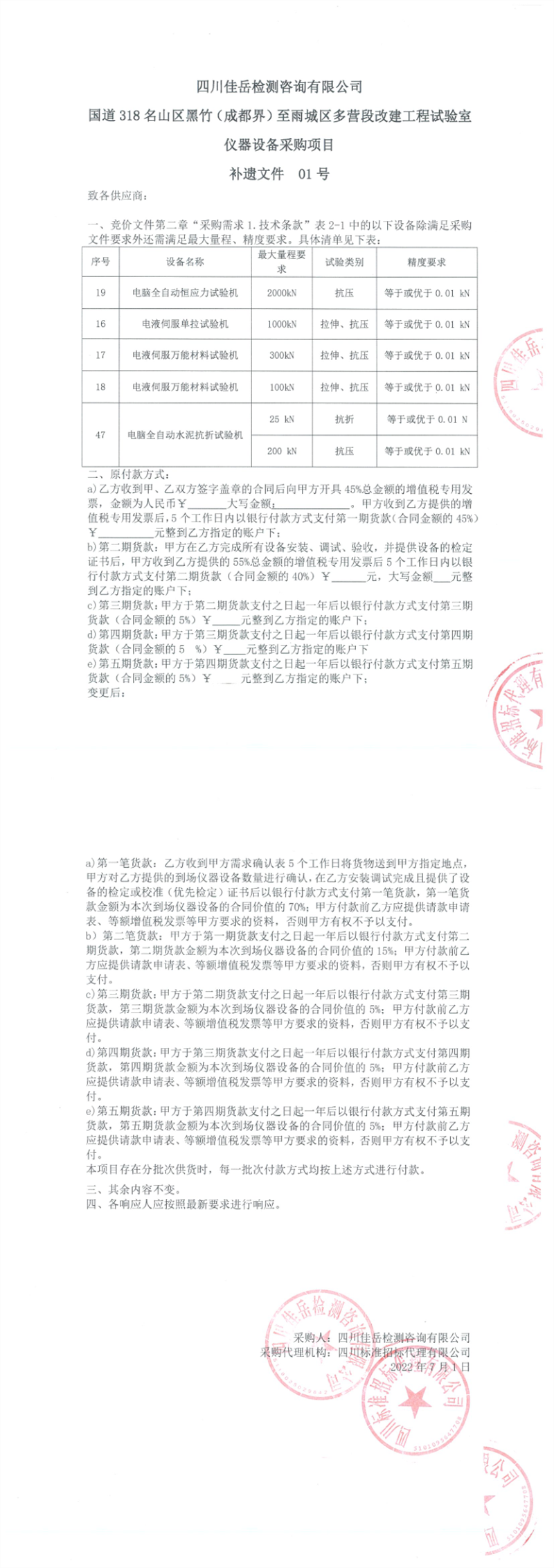 四川佳岳檢測(cè)咨詢有限公司國道318名山區(qū)黑竹(成都界)至雨城區(qū)多營段改建工程試驗(yàn)室儀器設(shè)備采購項(xiàng)目補(bǔ)遺文件01號(hào)