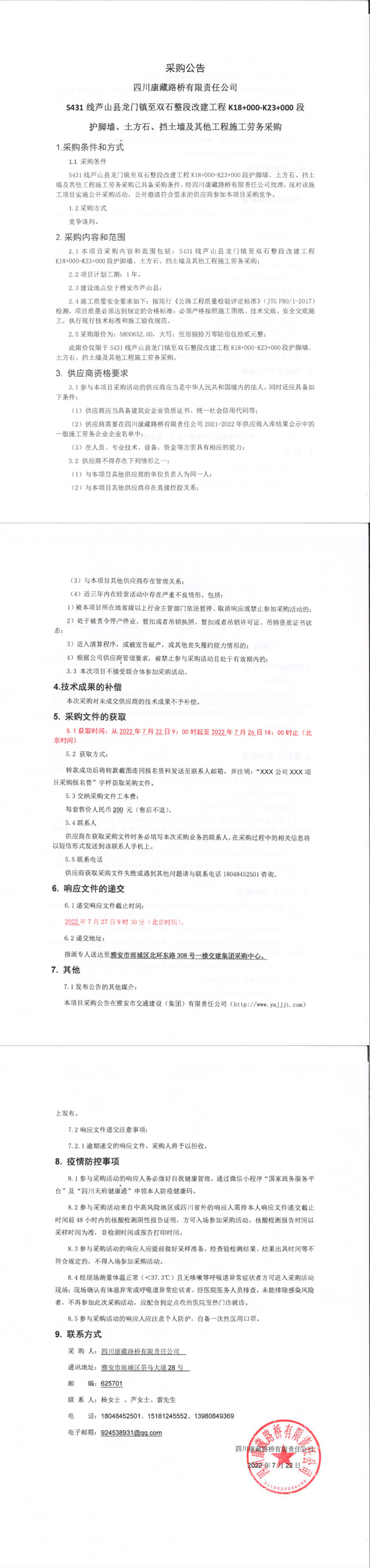 四川康藏路橋有限責任公司S431線蘆山縣龍門鎮(zhèn)至雙石整段改建工程K18+000-K23+000段護腳墻、土方石、擋土墻及其他工程施工勞務采購