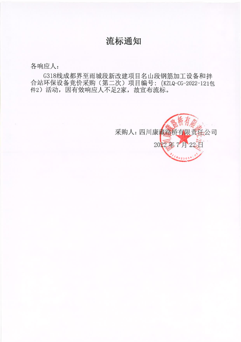 四川康藏路橋有限責任公司G318線成都界至雨城段新改建項目名山段鋼筋加工設(shè)備和拌合站環(huán)保設(shè)備競價采購(第二次)包件2流標通知