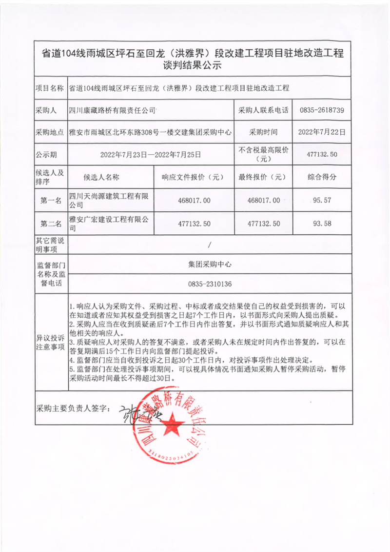 四川康藏路橋有限責(zé)任公司省道104線(xiàn)雨城區(qū)坪石至回龍(洪雅界)段改建工程項(xiàng)目駐地改造工程談判結(jié)果公示