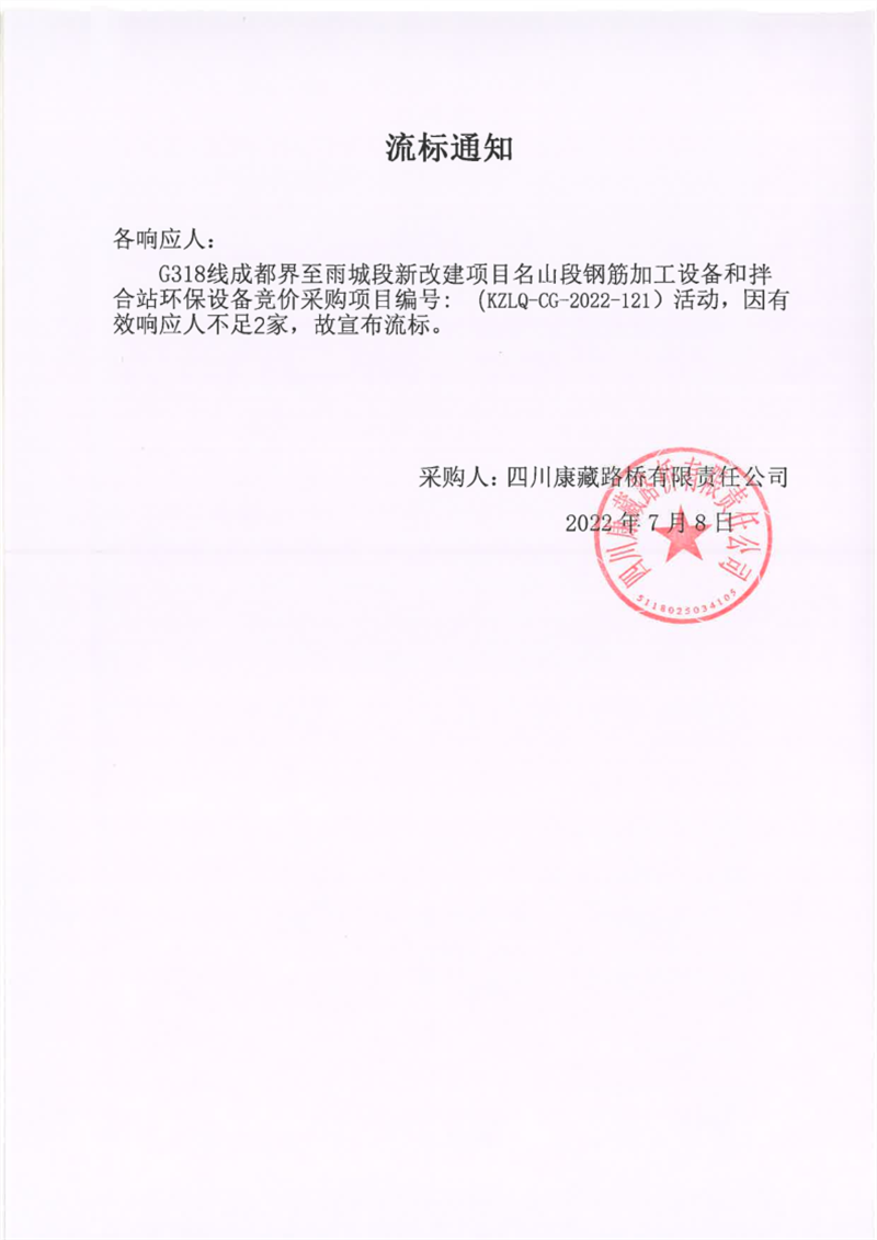四川康藏路橋有限責(zé)任公司G318線成都界至雨城段新改建項目名山段鋼筋加工設(shè)備和拌合站環(huán)保設(shè)備競價采購項目流標(biāo)通知