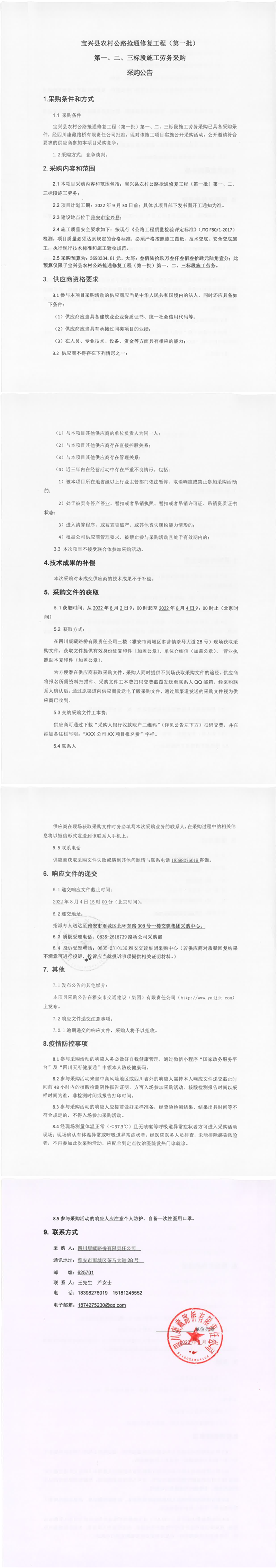 四川康藏路橋有限責任公司寶興縣農(nóng)村公路搶通修復工程(第一批)第一、二、三標段施工勞務采購采購公告