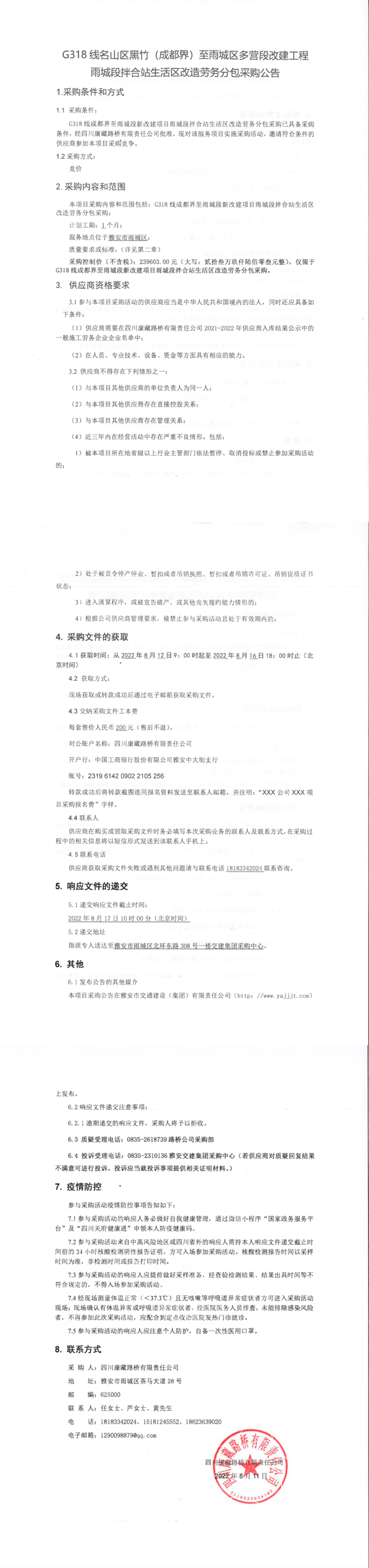 四川康藏路橋有限責(zé)任公司G318線(xiàn)名山區(qū)黑竹(成都界)至雨城區(qū)多營(yíng)段改建工程雨城段拌合站生活區(qū)改造勞務(wù)分包采購(gòu)公告