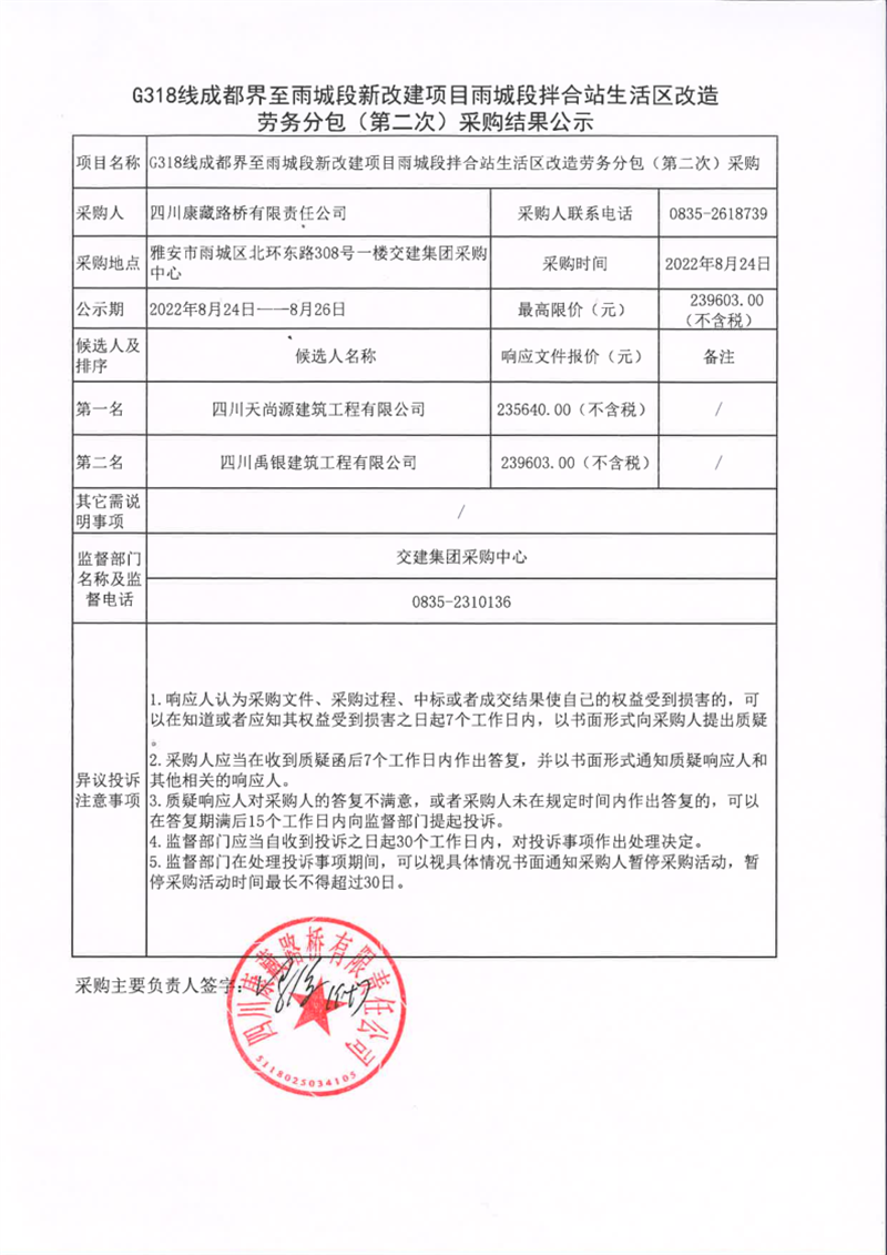 四川康藏路橋有限責任公司G318線成都界至雨城段新改建項目雨城段拌合站生活區(qū)改造勞務分包(第二次)采購結(jié)果公示