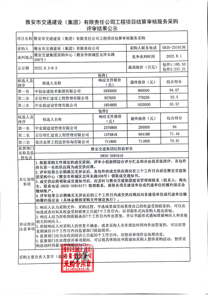 雅安市交通建設(集團)有限責任公司工程項目結(jié)算審核服務采購評審結(jié)果公示