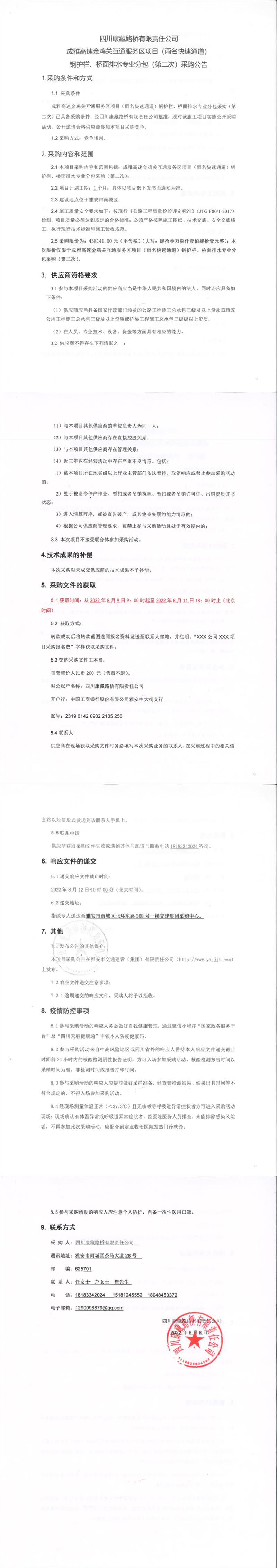 四川康藏路橋有限責任公司成雅高速金雞關互通服務區(qū)項目(雨名快速通道)鋼護欄、橋面排水工程專業(yè)分包(第二次)采購公告