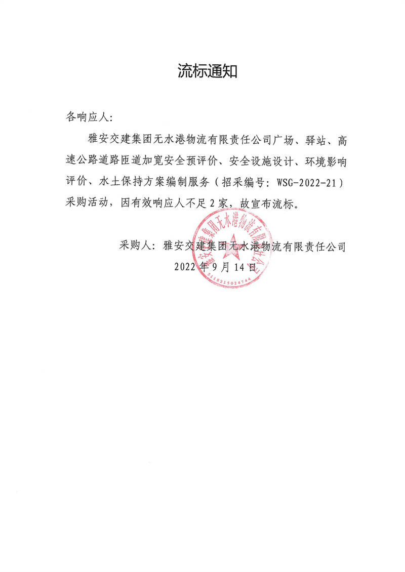 雅安交建集團(tuán)無水港物流有限責(zé)任公司廣場、驛站、高速公路道路匝道加寬安全預(yù)評價、安全設(shè)施設(shè)計(jì)、環(huán)境影響評價、水土保持方案編制服務(wù)采購流標(biāo)通知