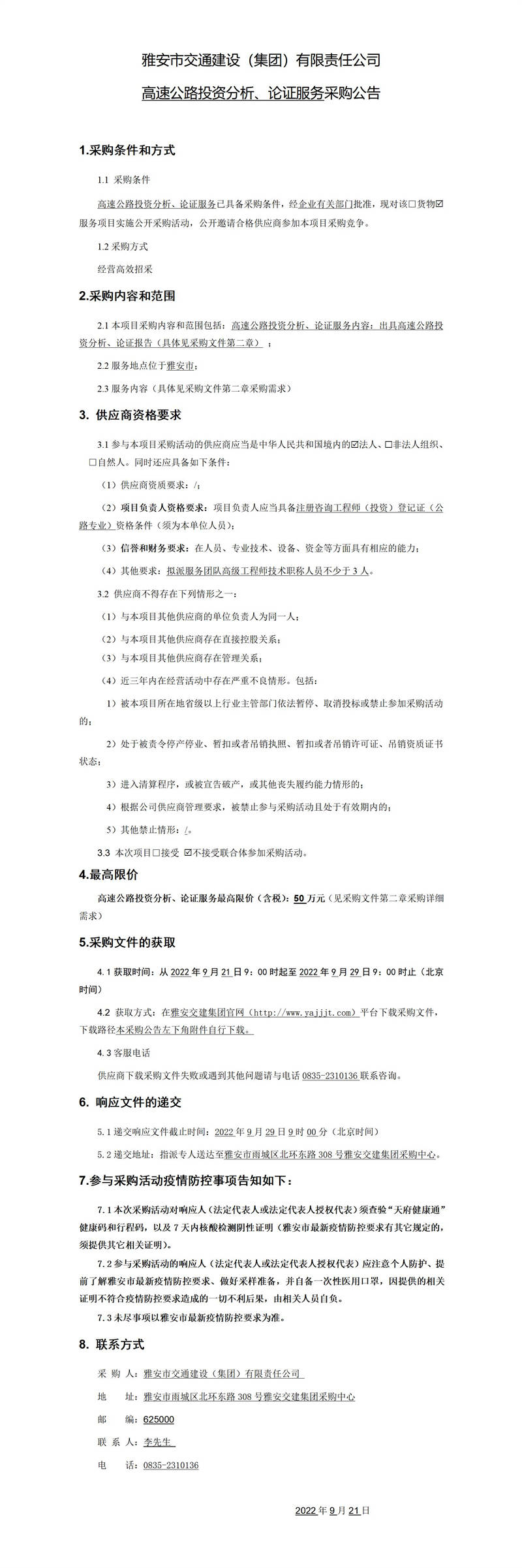 雅安市交通建設(shè)(集團)有限責(zé)任公司高速公路投資分析、論證服務(wù)采購公告
