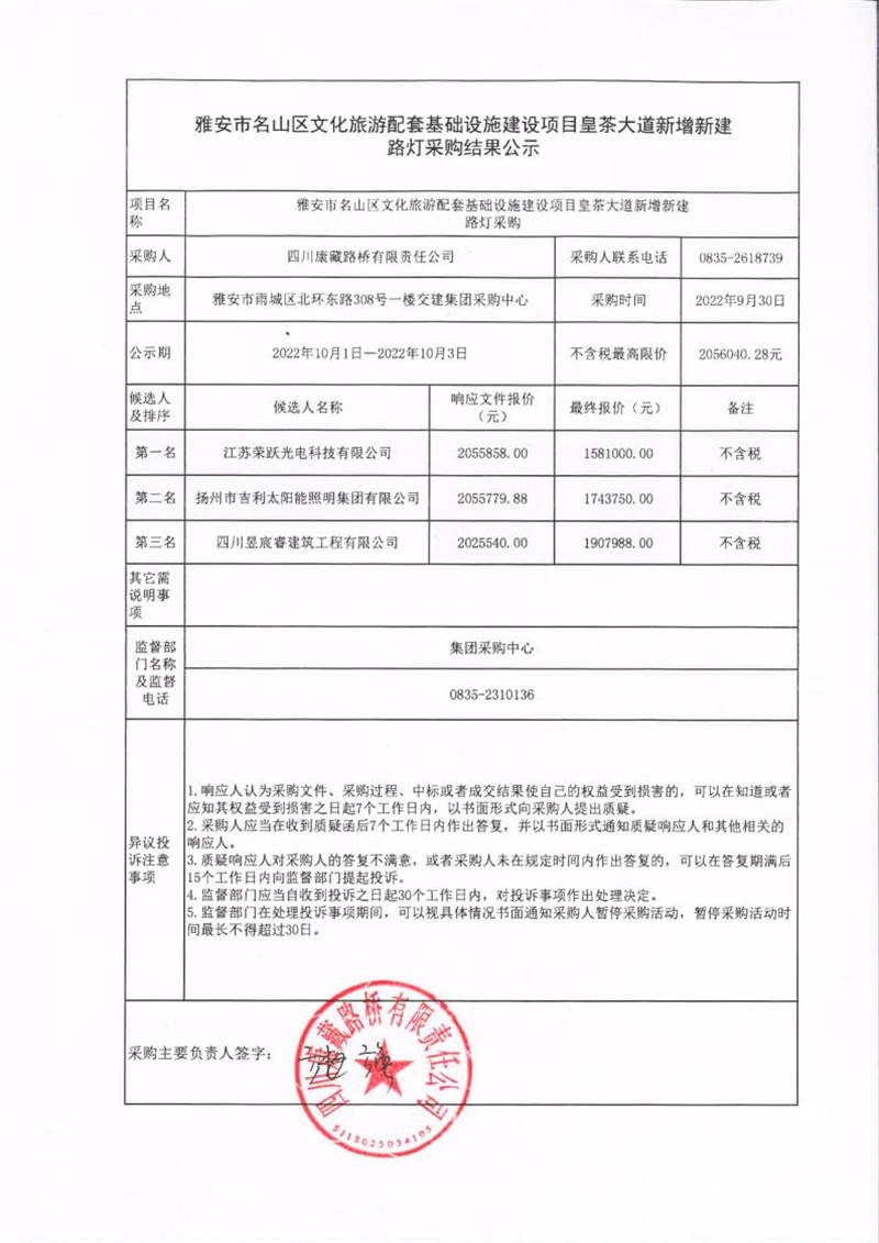 四川康藏路橋有限責任公司雅安市名山區(qū)文化旅游配套基礎設施建設項目皇茶大道新增新建路燈采購結果公示
