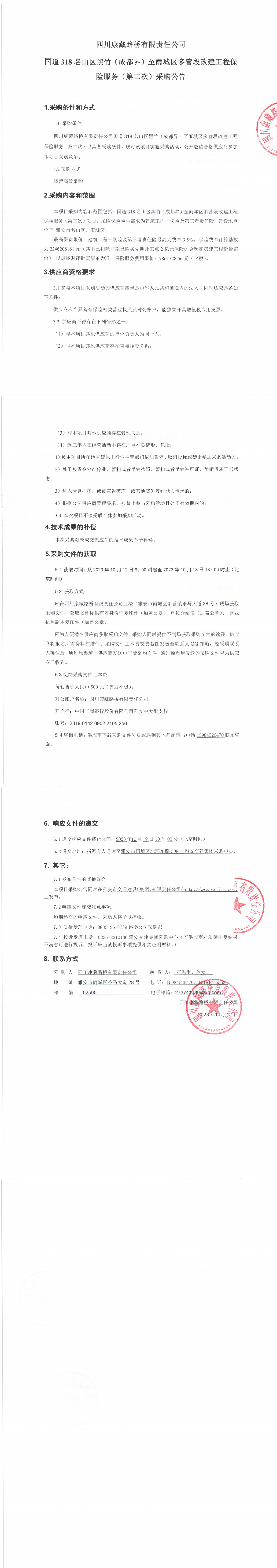 四川康藏路橋有限責(zé)任公司國道318名山區(qū)黑竹(成都界)至雨城區(qū)多營段改建工程保險服務(wù)(第二次)采購公告