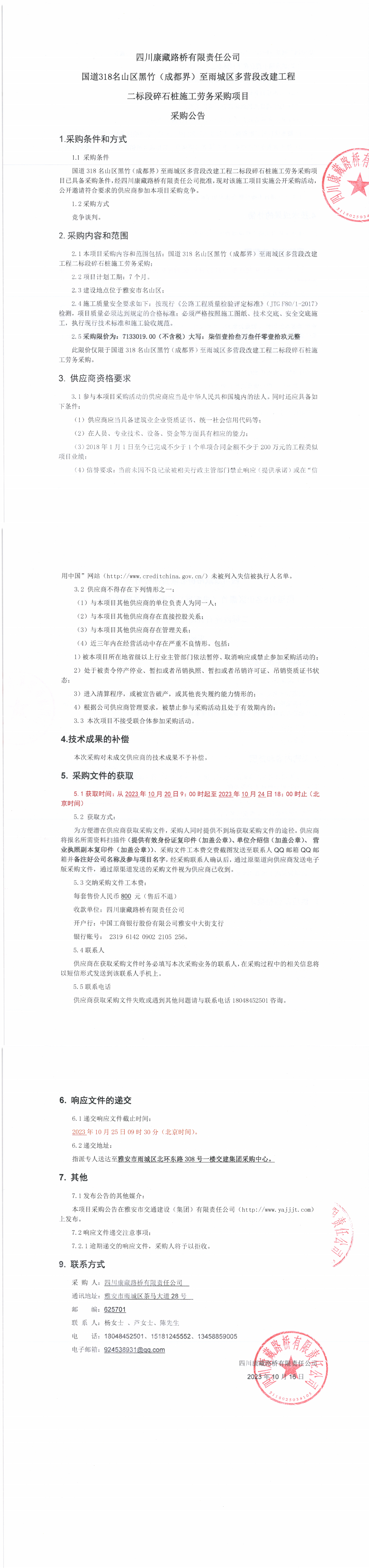 四川康藏路橋有限責(zé)任公司國道318名山區(qū)黑竹(成都界)至雨城區(qū)多營段改建工程二標(biāo)段碎石樁施工勞務(wù)采購項目采購公告