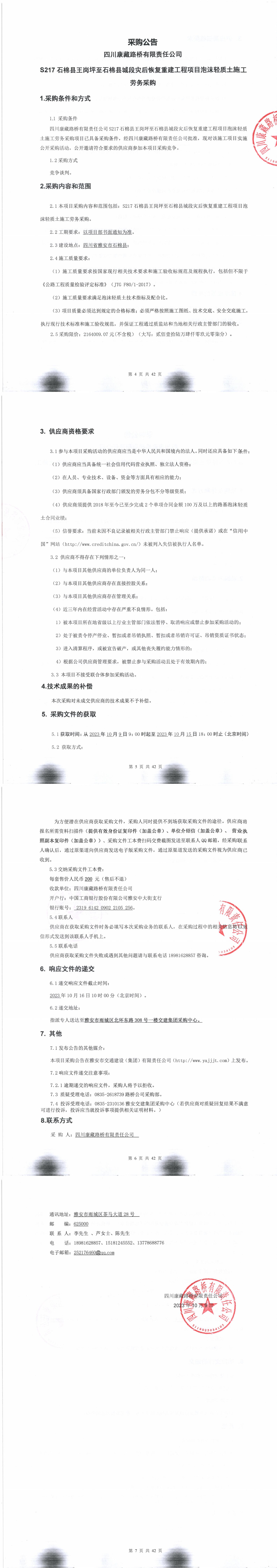 四川康藏路橋有限責任公司S217石棉縣王崗坪至石棉縣城段災后恢復重建工程項目泡沫輕質(zhì)土施工勞務采購公告