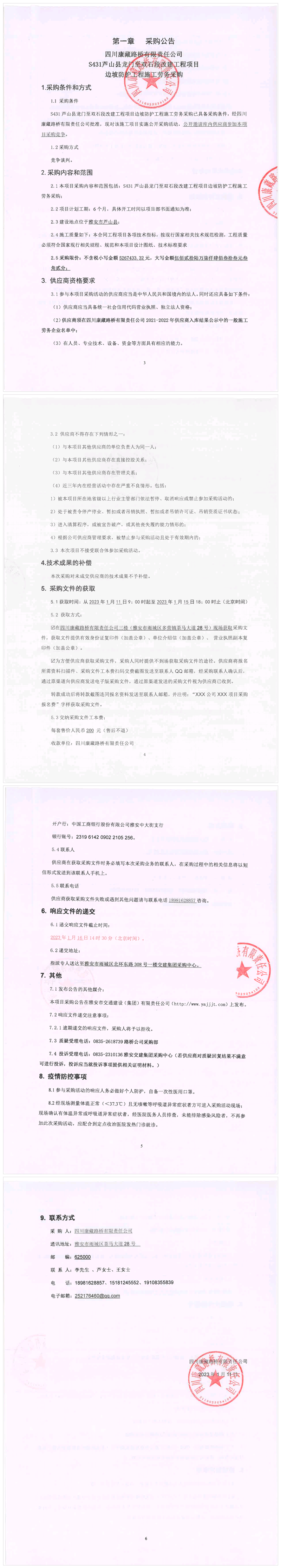 四川康藏路橋有限責(zé)任公司S431蘆山縣龍門至雙石段改建工程項(xiàng)目邊坡防護(hù)工程施工勞務(wù)采購競(jìng)爭(zhēng)談判結(jié)果公示