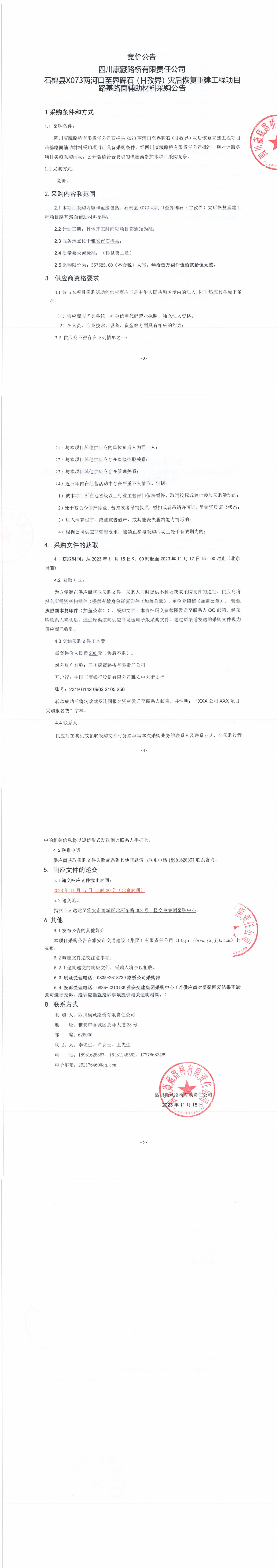 四川康藏路橋有限責任公司石棉縣X073兩河口至界碑石(甘孜界)災后恢復重建工程項目路基路面輔助材料采購公告
