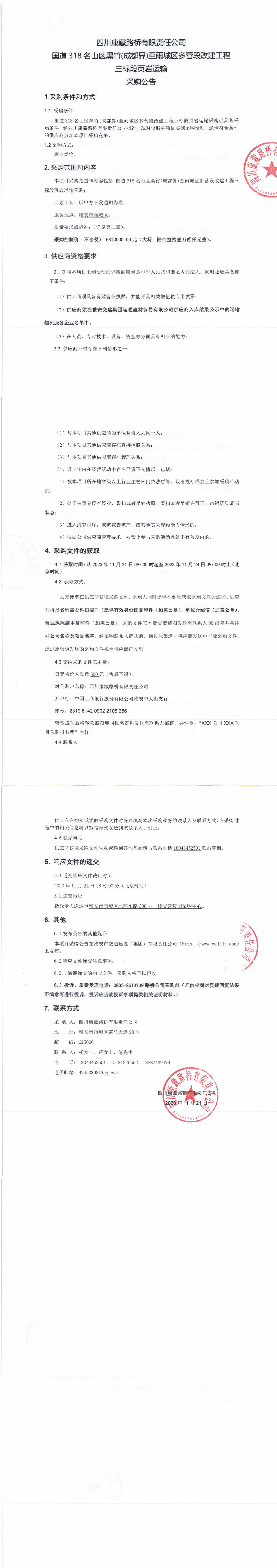 四川康藏路橋有限責(zé)任公司國道318名山區(qū)黑竹(成都界)至雨城區(qū)多營段改建工程三標(biāo)段頁巖運輸采購公告